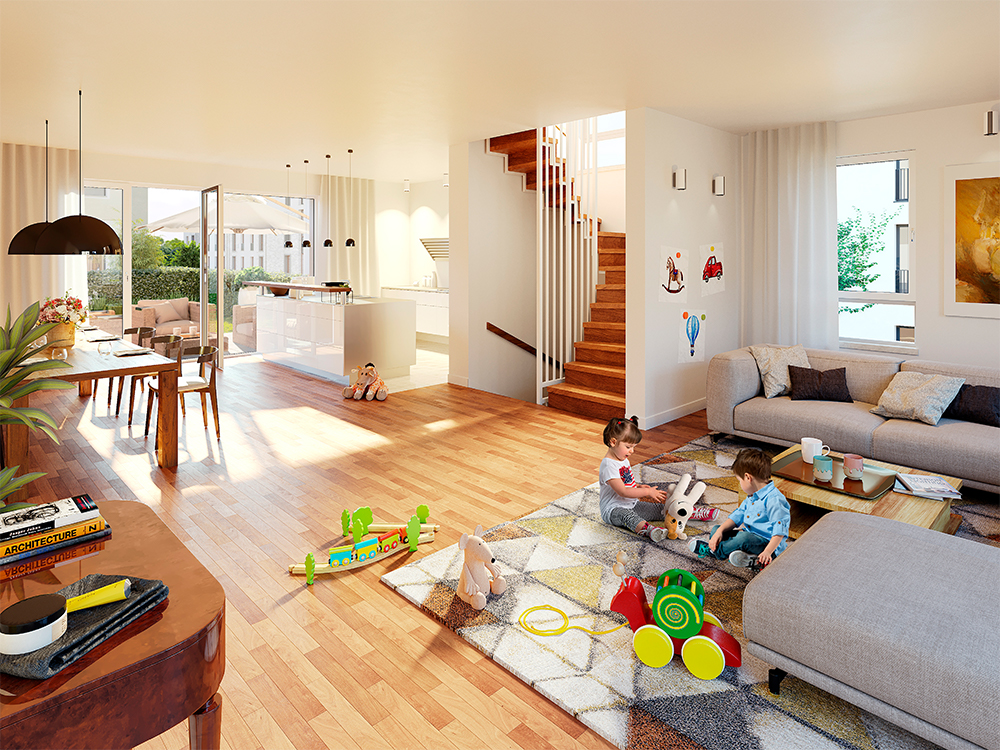 Familienleben ist quirlig, bunt und jeden Tag anders. Ein Leben, dass Platz braucht. Viel Platz. Denn Familie ist Leben, Lernen, Arbeiten, Entspannen, Spielen, Kochen und Essen. Familie ist offenes Miteinander und Sich-Zurückziehen-Können. Es ist Leben drinnen. Und draußen. All das ist Ihr neues Zuhause. Ihr HAUS IM VIERTEL.