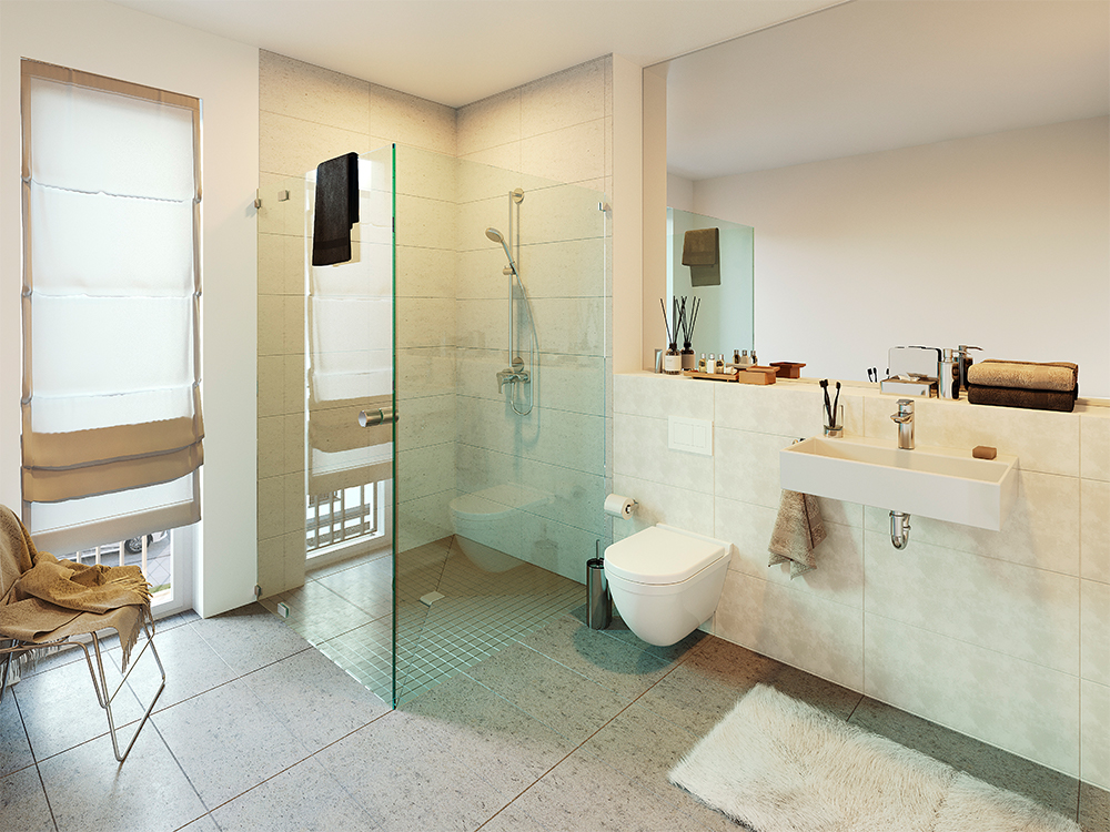 Bereits im Flur können auf Wunsch hochwertige und großformatige Keramik-Fliesen bewundert werden, bei denen Sie aus vier Farben wählen konnten. Das gilt auch für das verlegte Eichenparkett im Wohnbereich. Man kann es durch die Vollglas-Tür aus dem Flur bereits schimmernd glänzen sehen. Die bodentiefen Fenster zaubern warmes Licht in den großen Wohn-Essbereich. Die zum Parkettkontrastierenden weißen und zeitlos eleganten Türen mit ihren klar gestalteten Edelstahl-Drückergarnituren machen auf den ersten Blick klar, dass Qualität in jedem Detail umgesetzt worden ist. Auf die Frage Ihrer Freunde, wie es um die unsichtbare Qualität steht, antworten Sie mit den Begriffen „kostensparende Nahwärme“ und „energieeffizient nach EnEV“. Das klingt zwar technisch, ist aber der perfekte Zweiklang für behagliches Wohnklima zu jeder Jahreszeit. Übrigens sorgen unter anderem diese Merkmale dafür, dass der bei Finanzierungen nützliche KfW-55-Standard (Stand 2020) erreicht wird. Weiter geht es zum Balkon, um bei einem tollen Blick ins Münsterländchen den Abend mit einem Glas Wein ausklingen zu lassen …