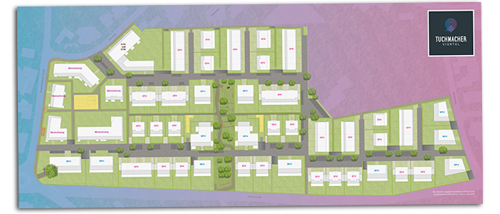 Damit Sie sich schon einen Eindruck über das Gesamtgelände verschaffen können stellen wir Ihnen ebenfalls unseren Gesamtgebietsplan vor. In diesem können Sie unterscheiden, an welcher Stelle sich zukünftig Einfamilienhäuser befinden, wo es die Möglichkeit gibt in ein Mehrfamilienhaus zu ziehen, an welcher Stelle sich Mietobjekte befinden und wo womöglich Ihre Kinder zur Kita gehen können…